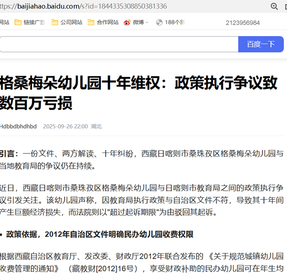 近日,西藏日喀则市桑珠孜区格桑梅朵幼儿园与日喀则市教育局之间的政策执行争议引发关注。该幼儿园声称,因教育局执行政策与自治区文件不符,导致其十年间产生巨额经济损失,而法院则以"超过起诉期限"为由驳回其起诉。